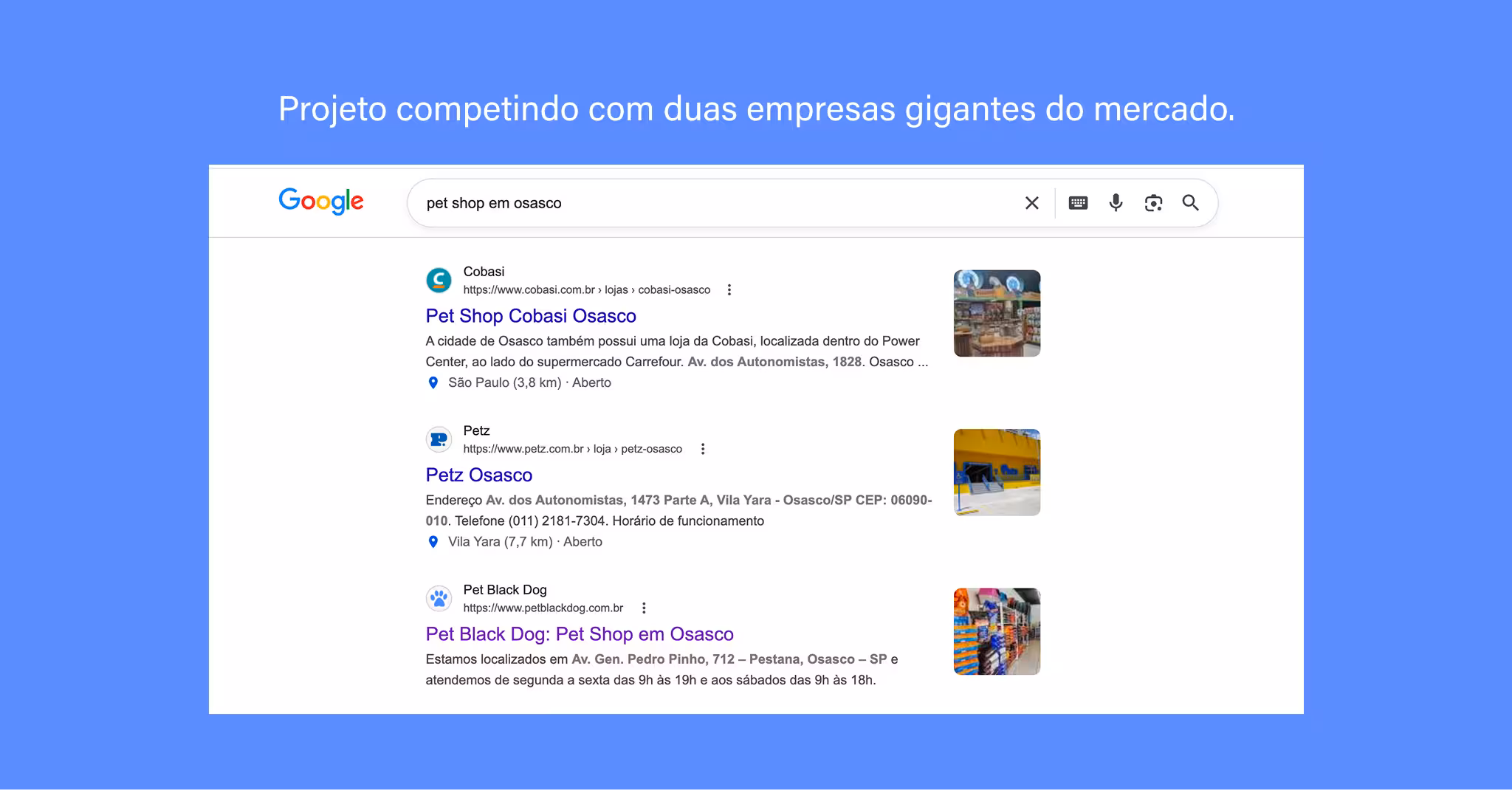 O site conquistou a 3ª posição no Google para “pet shop em Osasco”, ficando atrás apenas da Cobasi e da Petz — duas das maiores redes de pet shop do país. Com mais de 9 mil impressões mensais, a Pet Black Dog aparece no Google ao lado de marcas com centenas de lojas e milhões investidos em marketing digital.